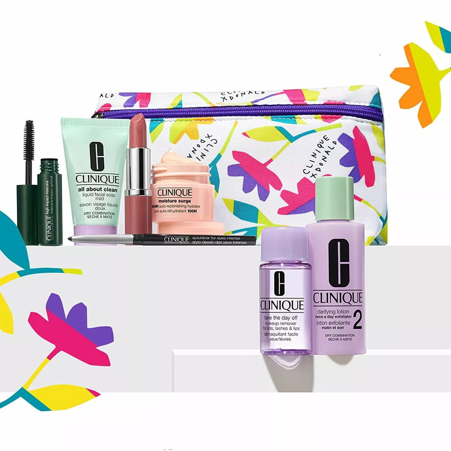All About Clean Liquid Facial Soap Mild 30ml, Moisture Surge 100H, 15ml, Clinique Pop Lip in Bare Pop, Quickliner For Eyes Intense in Intense Black, High Impact Mascara in Black, and an exclusive makeup bag | Wind Down Duo with a Take The Day Off Makeup Remover 50ml and a Clarifying Lotion 2 60ml.